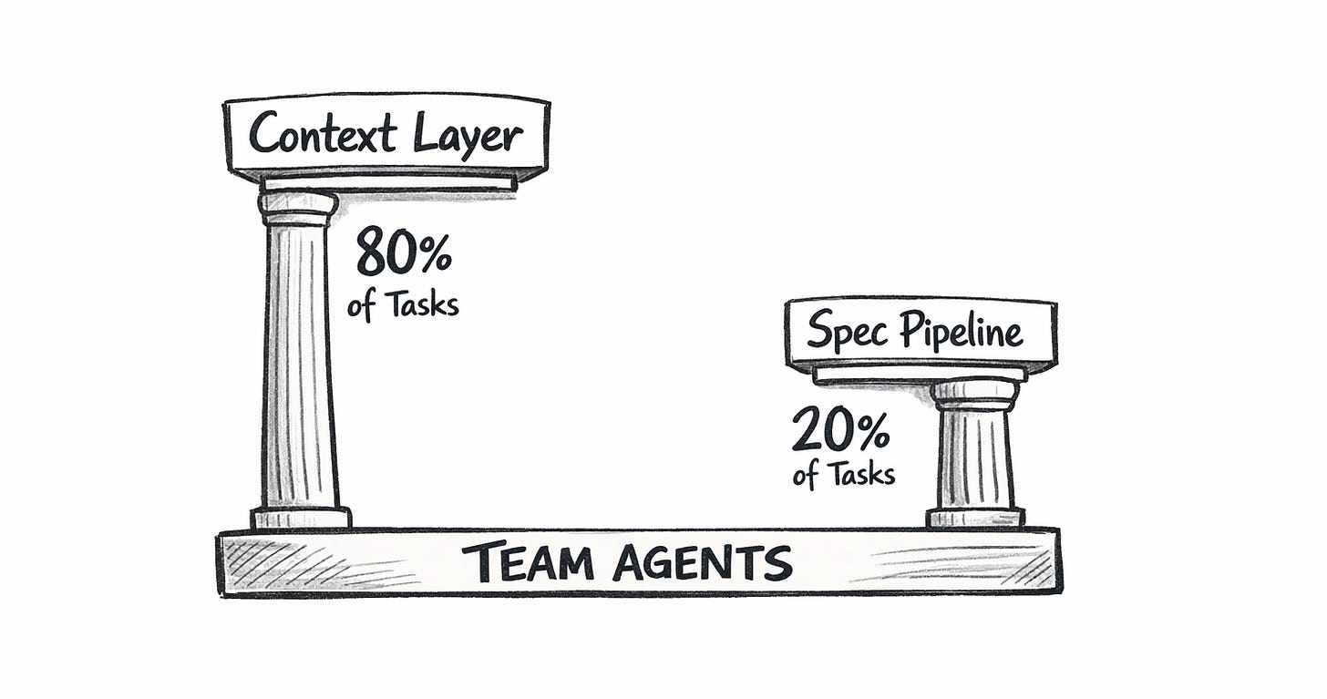 The broader evolution: CDD started as “spec-driven development plus RAG-like context.” Team Agents made the spec execution trivial. Now the leverage is almost entirely in the context layer — the quality of what agents read before they start working. The specs still matter for complex features. But the context files determine whether an agent codes like a stranger or like a teammate who’s been on the project for months.