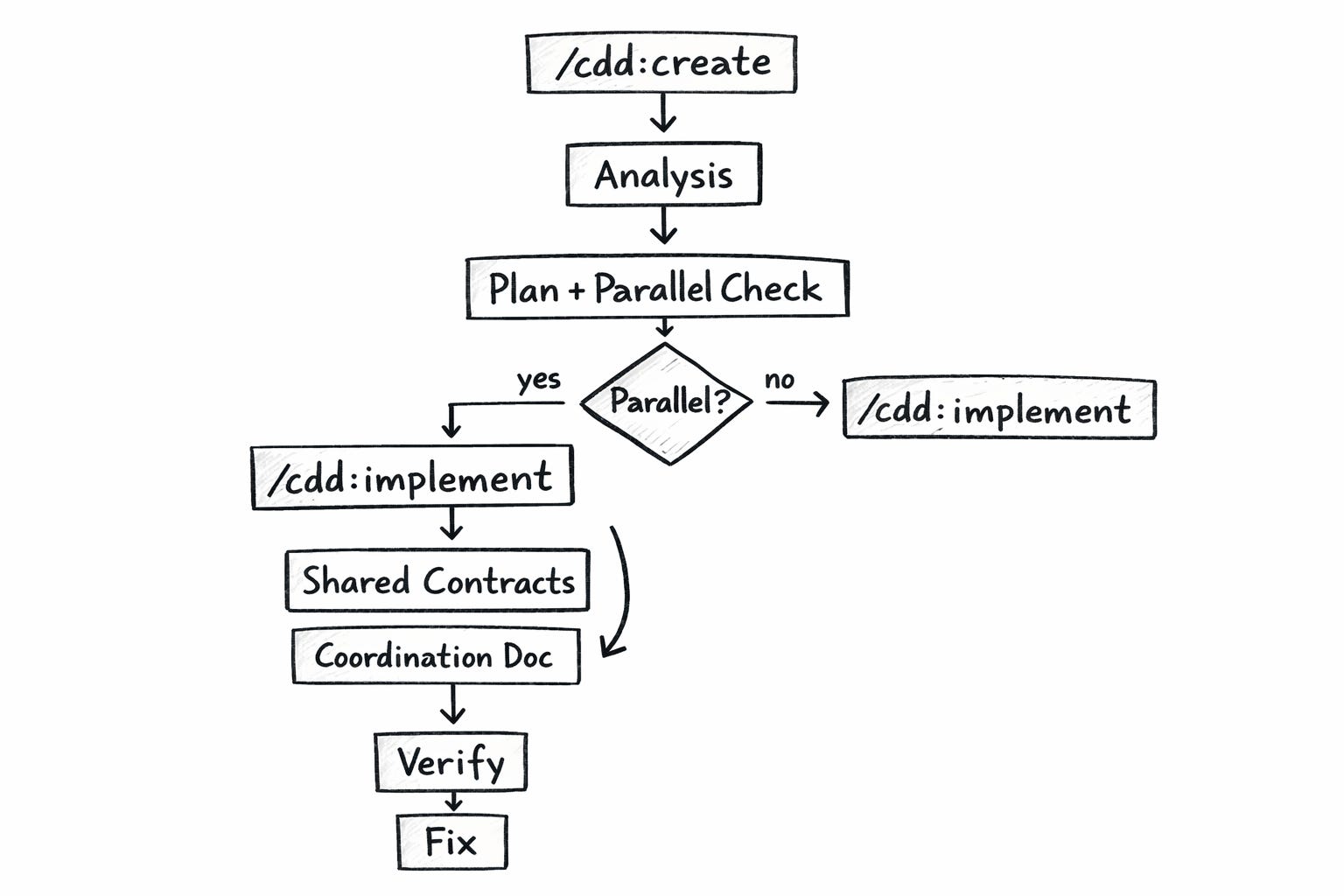/cdd:implement executes the plan. In single-agent mode, it works through steps one by one. With the --parallel flag, it does something more interesting. It reads the parallelization assessment, creates a coordination file with shared TypeScript interfaces, implements those agreements first, then launches all parallel agents in a single API call — each with their assigned scope and a pointer to the coordination file.