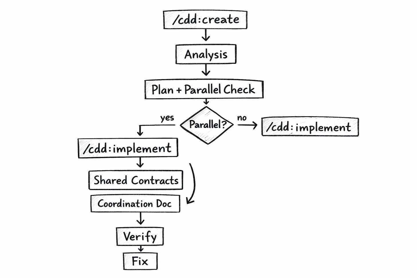 /cdd:create takes a feature description and produces two documents. First, an analysis of your current codebase — what already exists, what’s missing, what constraints apply. Second, an implementation plan with numbered steps. The plan includes something crucial: a parallelization assessment — an analysis of whether parts of the work can be split across multiple agents working simultaneously.