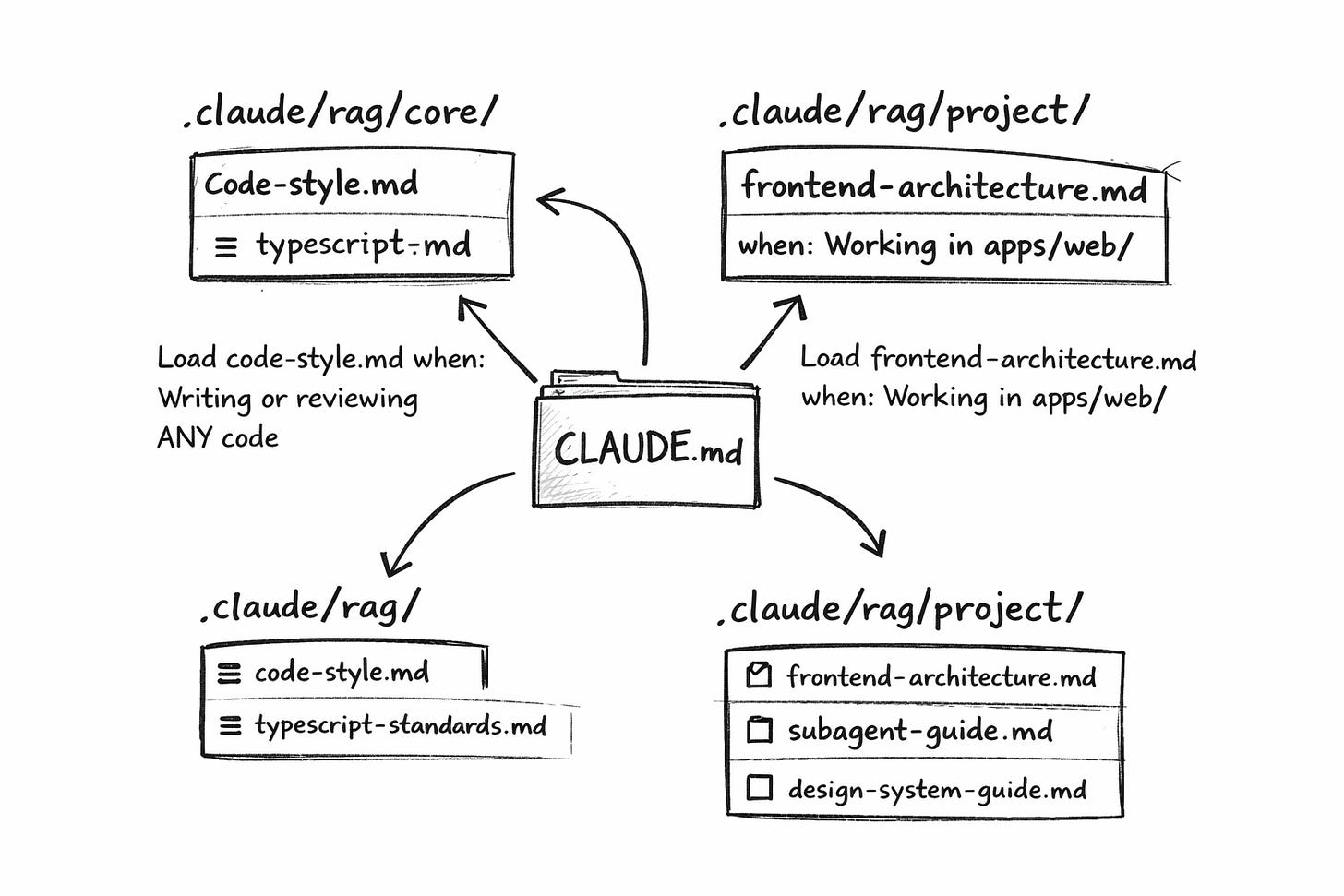│ └── design-system-guide.mdThe root CLAUDE.md acts as a table of contents with loading triggers:
