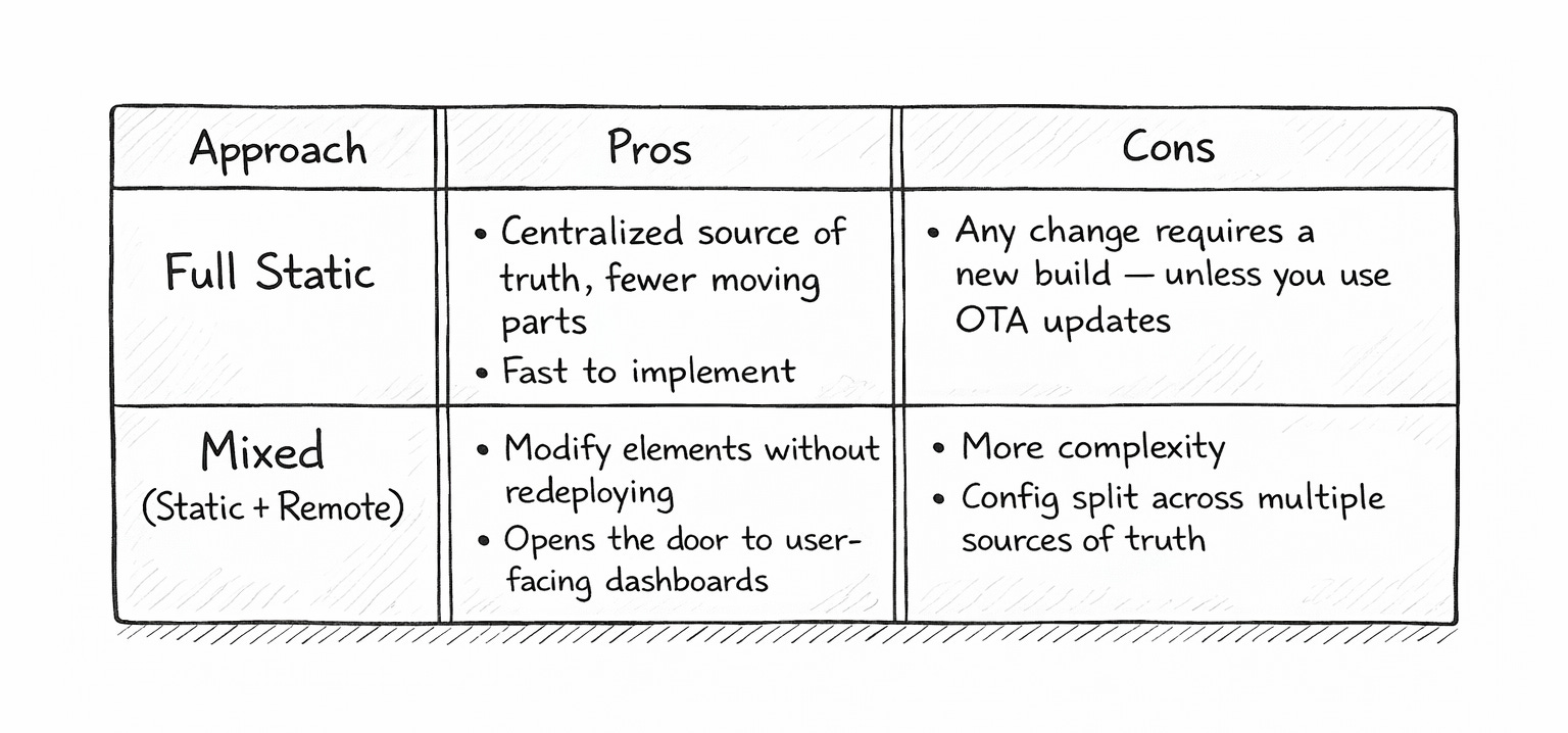 My advice: start fully static. Get the system working end-to-end with everything controlled at build time. You can always layer in remote config later once you understand what actually needs to change dynamically. Don’t over-engineer day one.