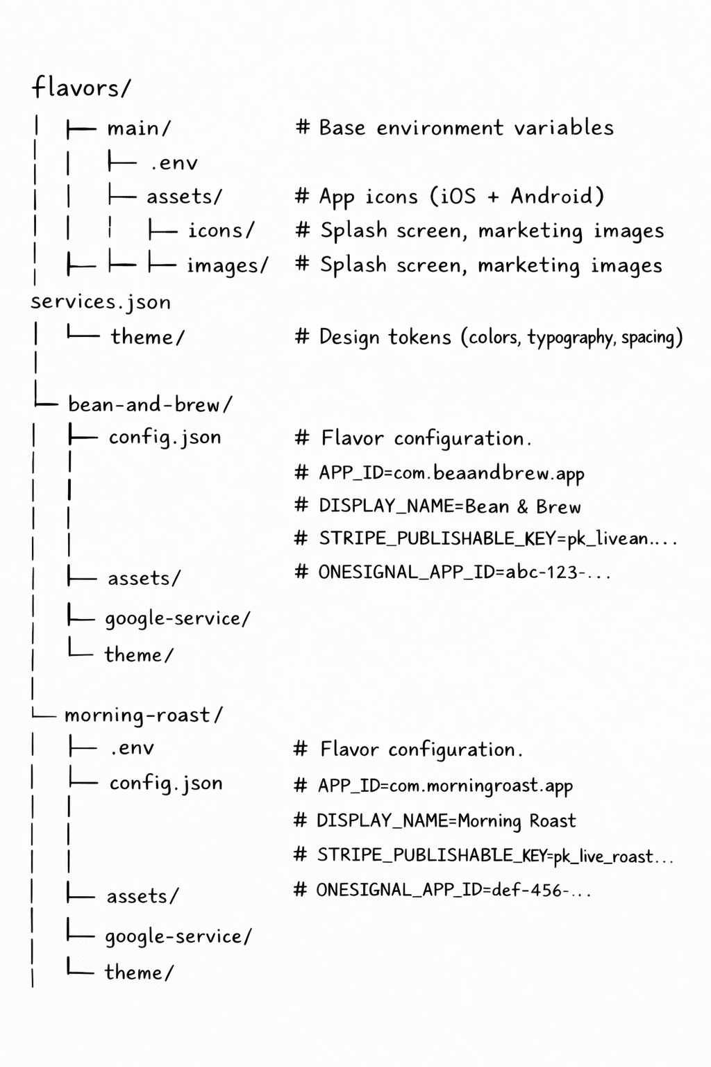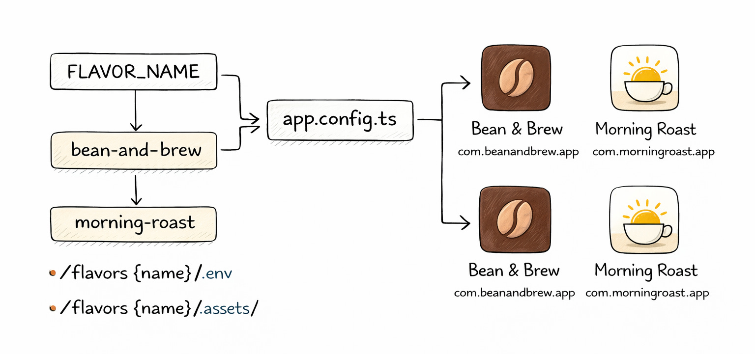 The entire flavor system hinges on one environment variable: FLAVOR_NAME. When you set FLAVOR_NAME=bean-and-brew, the config file loads that flavor’s configuration, points to that flavor’s assets, and wires up that flavor’s third-party keys. The output is a fully configured app — different bundle ID, different name, different icon, different everything.