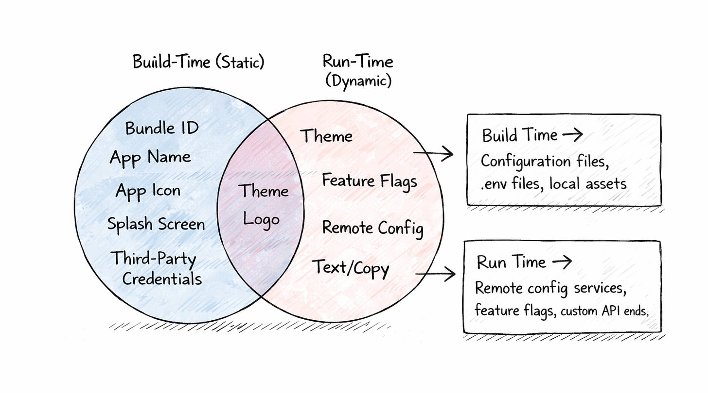 Here’s the key insight: anything that can be dynamic can also be static. You can always hardcode a value that you’d otherwise fetch remotely. But the reverse isn’t true — you can’t change a bundle ID or an app icon at runtime. The store won’t let you.