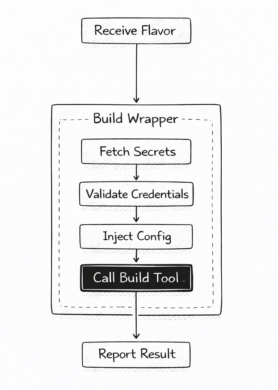 The first thing you build on top of it is a wrapper: a script that sits between your CI pipeline and the build tool. It handles everything the build tool doesn’t know about — flavors, secrets, credential validation, and dynamic config injection.