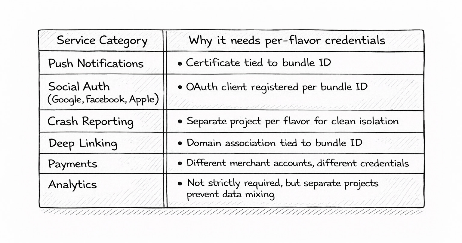 This is the part people underestimate. White-labeling isn’t just visual — each flavor often needs its own set of credentials for the third-party services your app depends on.