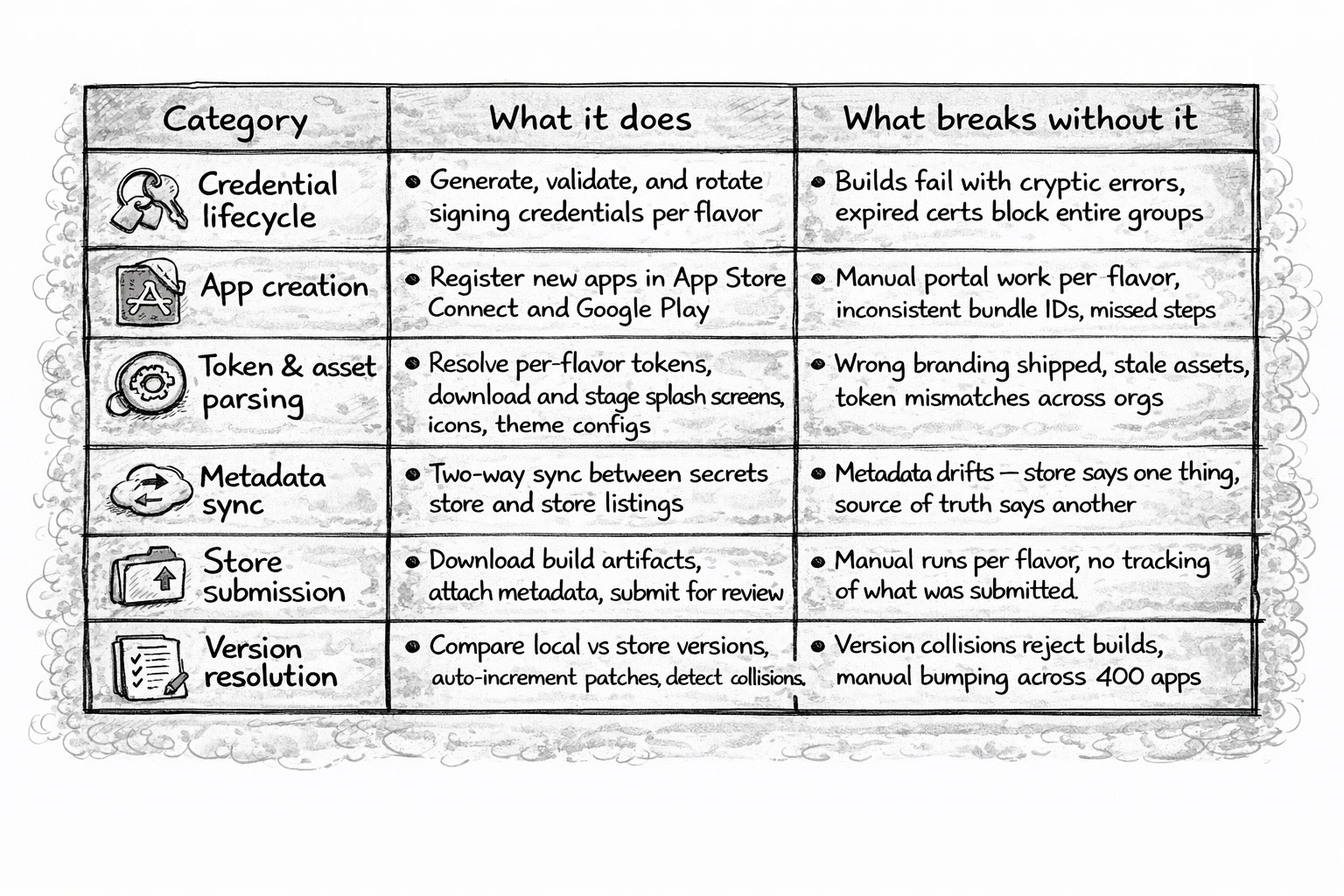Think about what happens without it. A new engineer joins the team and needs to ship a hotfix across 400 apps. Without the package, they need tribal knowledge — which flags to pass, where the keys live, how to check agreements, how to avoid version collisions, which metadata fields to sync, and in which direction. That knowledge lives in someone’s head. It leaves when they do.
