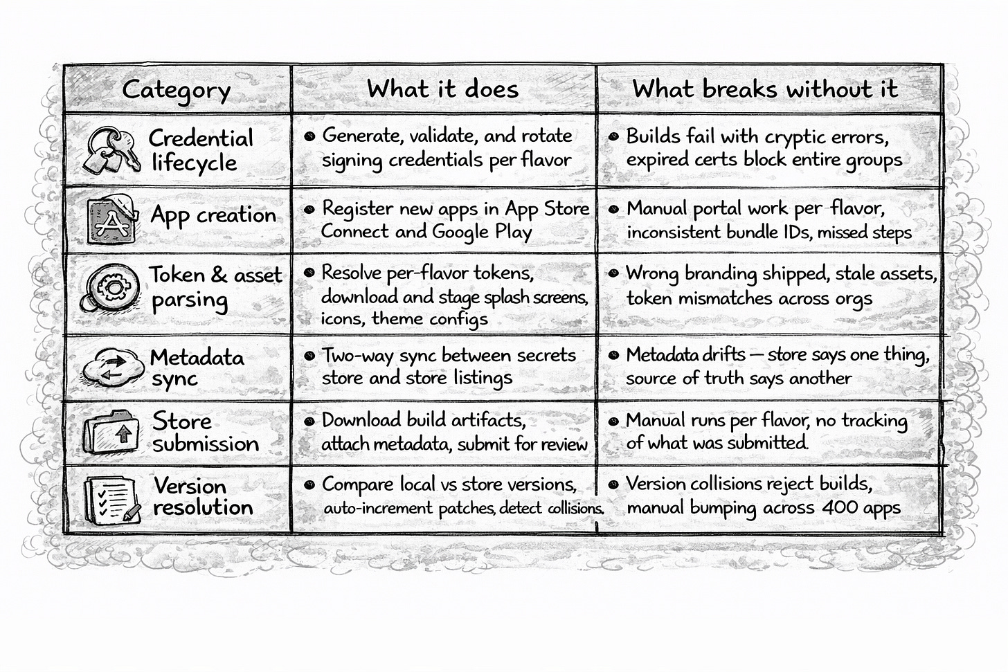 The roadmap made it clear. We weren’t going to manage 10 or 20 white-label apps — we were going to manage hundreds. Each of those apps would need its own signing credentials, store listing, metadata, and developer agreement with Apple. Multiply that by two platforms, and the operational surface area becomes enormous before you ship a single binary.
